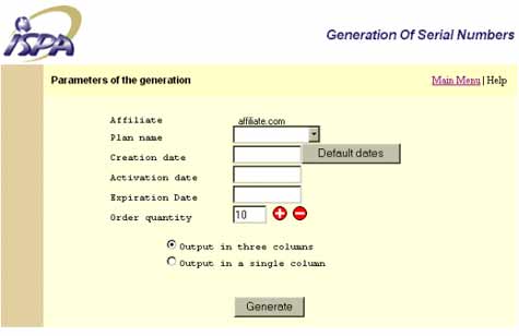 To Generate Serial Numbers and Activation Keys:Choose the Marketing Plan name that you want your customers created under. For instance, if you have a plan called OLR, you would choose OLR for the Plan Name. The Activation and Expiration Dates for the Serial Numbers and Activation Keys, can automatically be inserted into the form by clicking on the "Default dates" button. The Order Quantity field automatically defaults to 10, however any number of Serial Numbers and Activation Keys can be created at one time, by either clicking in the field and manually changing the number, or clicking on the "+" or "-" signs.