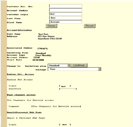Type The Change Account Type screen allows for the modification of existing accounts. You can change both the Marketing Plan and the Package that the customer was created under in three steps. To modify a customer, click on the Change Account Type screen, and query the customer. Once the customer's information comes up, you will see this screen: