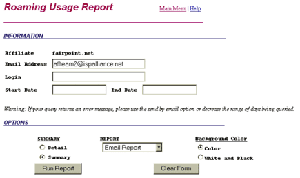 Roaming Usage ReportThe Roaming Usage Report will give you an accurate count of the number of hours your Roaming customers have been on line. You can run your query by a single login, or by all of your users. It is recommended that when running a full report on all of your customers, that you have the report sent to you by email, as there is too much information for your browser to pull up, and may cause you to time out. You can set the query parameter by date, and by either running a detailed or a summarized report.
