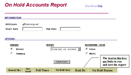 This screen is used to allow you to view all the accounts that are on hold. Accounts can be on hold for a variety of reasons such as user request, usage time, or payment failure. To run the report, fill in the start and end dates, choose detailed or summary, select where you want to view the report, then click on any of the links in the colored bar at the bottom of the screen. Which link you click on is how the report is going to sort.