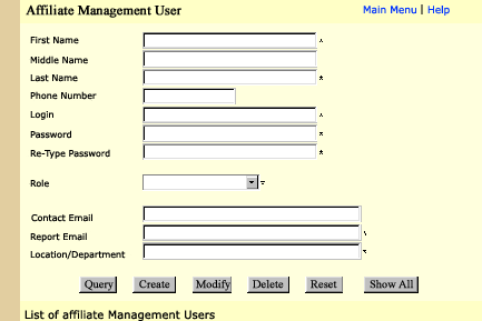 To add a user, type in all the necessary information on the form that is marked with an (*), and click on "Create". If you leave out any necessary information, an error message will appear to let you know that all the fields were not filled out correctly. To query an existing Affiliate Management User, type either their first and last name or login and click on the "Query" button at the bottom of the screen. To modify and existing Affiliate Management User, you must first query the user, make any modifications that you need and click on the "Modify" button. To delete a user, you must first query the existing user, click on the "Delete" button at the bottom of the screen. Note: The "Role" field contains roles to be assigned to the users. Roles limit how much access the user will have to the system, Aff Administrator being the most access, Aff oper lvl 1 having the least amount of access.